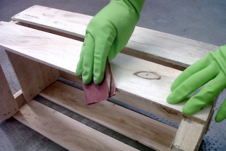 O primeiro passo é lixar todo o caixote e, caso haja grampos soltando, retire-os. Se considerar necessário, retire também pregos amassados ou enferrujados e substitua-os por novos.