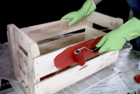 Coloque aos poucos a tinta na bandeja plástica e utilize o rolinho de lã para fazer a pintura de todo o caixote. Faça sempre movimentos em linha reta, seguindo a nervura da madeira.