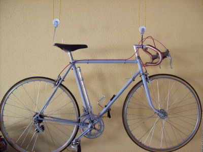 Aqui a bike na posição inferior, pronta para ser içada. Vale lembrar que com o auxílio das roldanas, o esforço para erguer a bike, é divido, isto é, desmultiplicado, ficando mais fácil erguer os 12 Kg da minha bike.