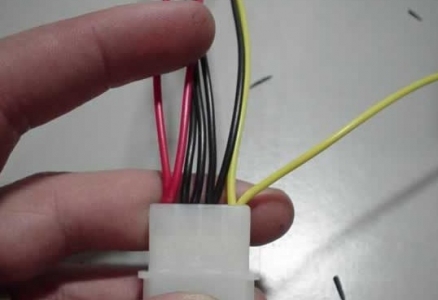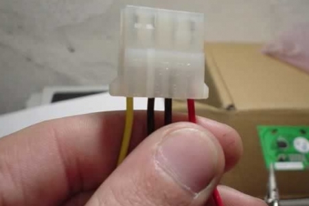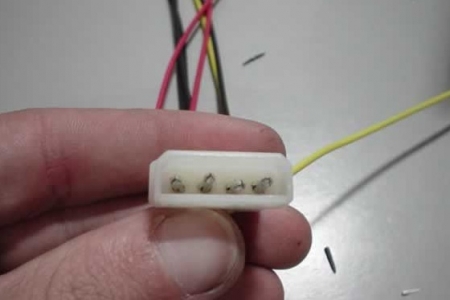 Agora será preparado o cabo conector da fonte (também conhecido como cabo Y ou extensor da fonte comprado em lojas de informática serve para colocar mais dispositivos em um computador quando os cabos da fonte não são o suficiente) que irá fornecer a energia para o LCD, note que neste cabo será necessário cortar o fio amarelo e da mesma maneira que você estanhou o cabo manga e o LCD, você deverá estanhar esse cabo (certifique-se de estar cortando a ponta certa como na imagem). Os fios usados serão somente os fios pretos (terra) e o vermelho (5V) o fio amarelo (12v) deverá ser eliminado como mostra a imagem
