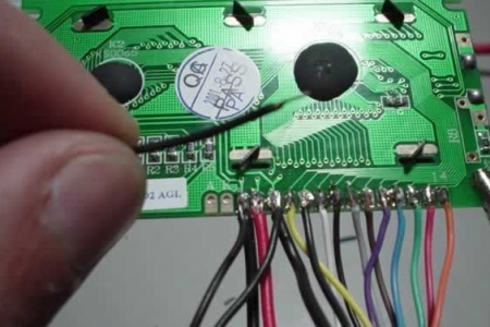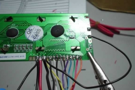 Novamente pegue um dos cabos (TERRA) que sobraram do conector de floppy drive e faça uma ligação como foi feito anteriormente, para poder se obter mais um fio TERRA, solde uma das extremidades no terminal do LCD que possuir a letra K.