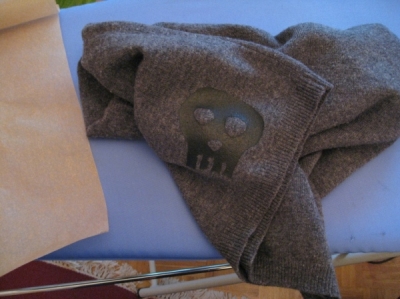 Agora é a hora da mágica acontecer! Com um ferro bem quente e SEM VAPOR, coloque sobre o papel manteiga e deixe lá por mais ou menos 20 segundos (não precisa apertar o ferro hein!)…vai dando aquela verificadinha pra ver se não vai queimar né gente, pq afinal tudo vai depender do tecido que vc está usando. O papel manteiga não deixa queimar, mas é bom se precaver não é…