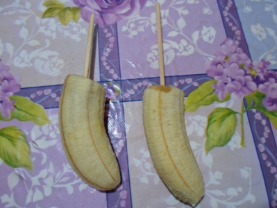 Primeiro você corta a banana no meio e coloca um palito de picolé ou um palito de churrasco mesmo.