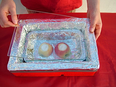 Por fim coloca o vidro maior por cima do teu forno. Se não tiveres oportunidade de arranjar um vidro, podes optar por um plástico transparente. Naturalmente quanto mais grosso for, maior será a retenção da temperatura dentro da caixa.