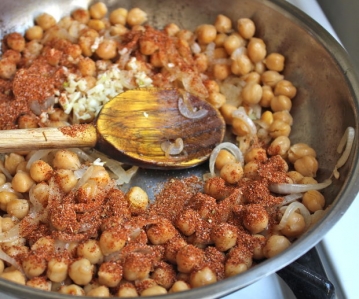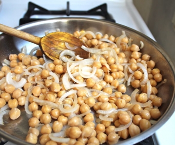 Aqueça uma panela em fogo médio com um pouco de óleo. Coloque o grão de bico, cebola e uma pitada de sal. Você deve cozinhar mas não se esqueça de mexer com bastante freqüência, até que as cebolas e grão de bico comecem a dourar. Nesse ponto, adicione o alho picado e o tempero. :)