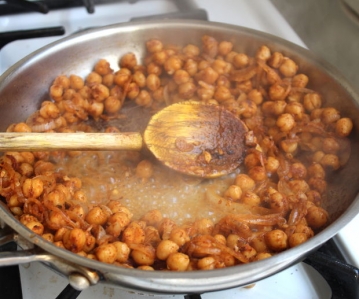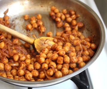 Mexa com o tempero e mais o alho em torno da panela para que ele começa a cobrir todos os grão de bico e cebolas.